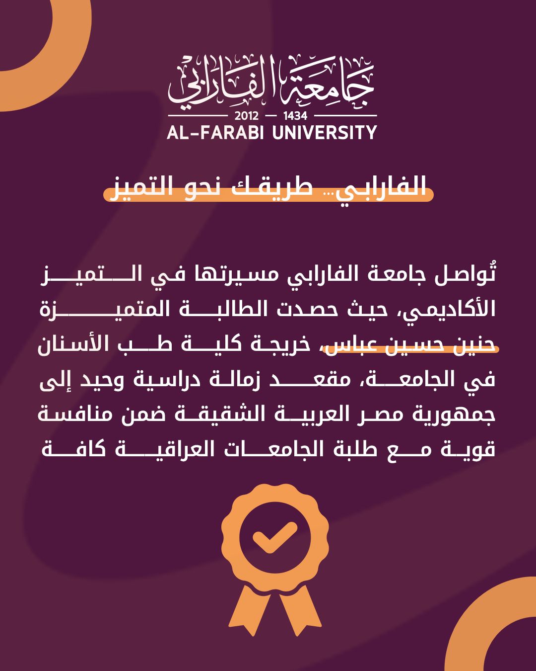 Al-Farabi University continues to shine academically, as the outstanding graduate Hanin Hussein Abbas, from the College of Dentistry, has secured an exclusive scholarship seat to the Arab Republic of Egypt, after a highly competitive selection process among students from all Iraqi universities.