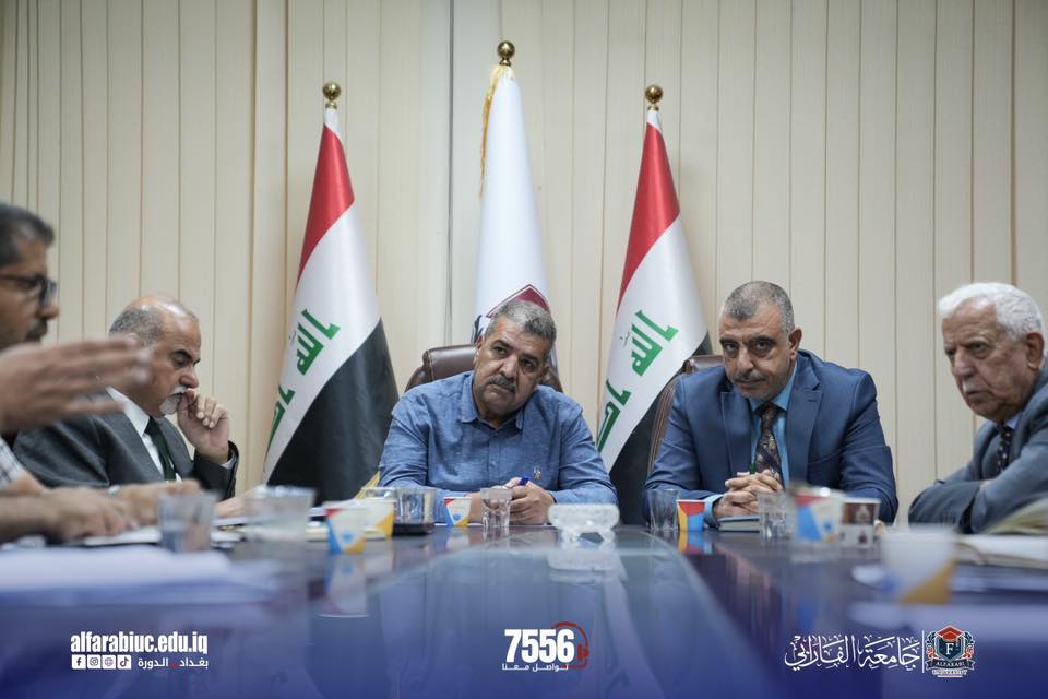On Wednesday, September 10, 2025, the Council of Al-Farabi University held its first meeting for the 2025/2026 academic year, attended by the esteemed Chairman of the Board of Trustees, Prof. Dr. Mueid Al-Jubouri, the University President, and respected members of the Council.