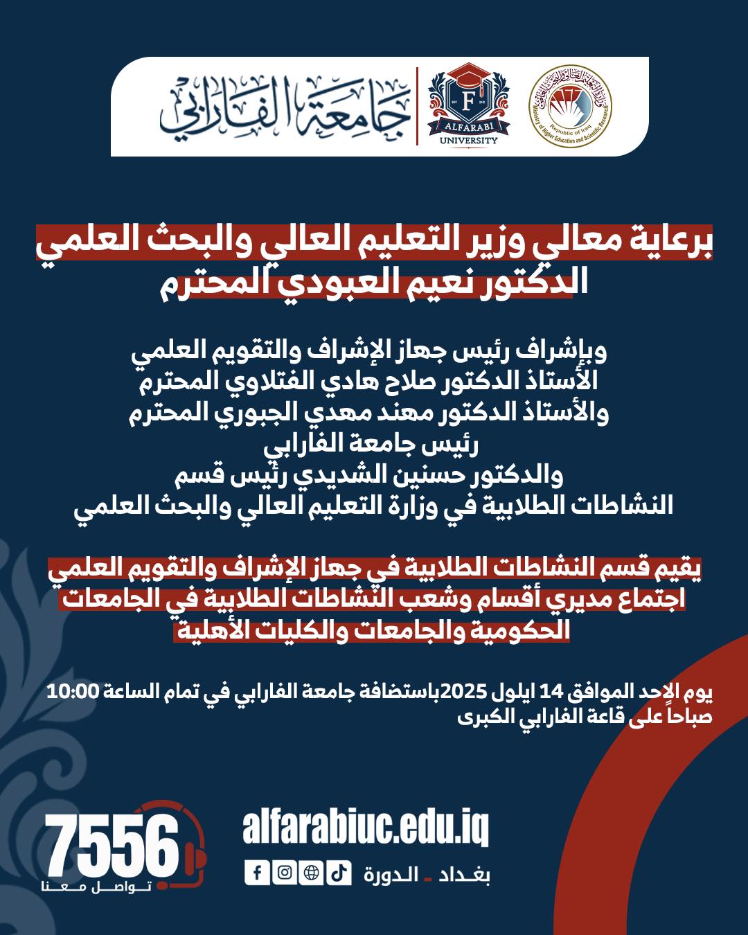 Al-Farabi University welcomes all participants and reaffirms its commitment to providing an excellent organizational setting that supports a productive meeting and actionable recommendations to enhance student activities across Iraq’s higher education institutions.