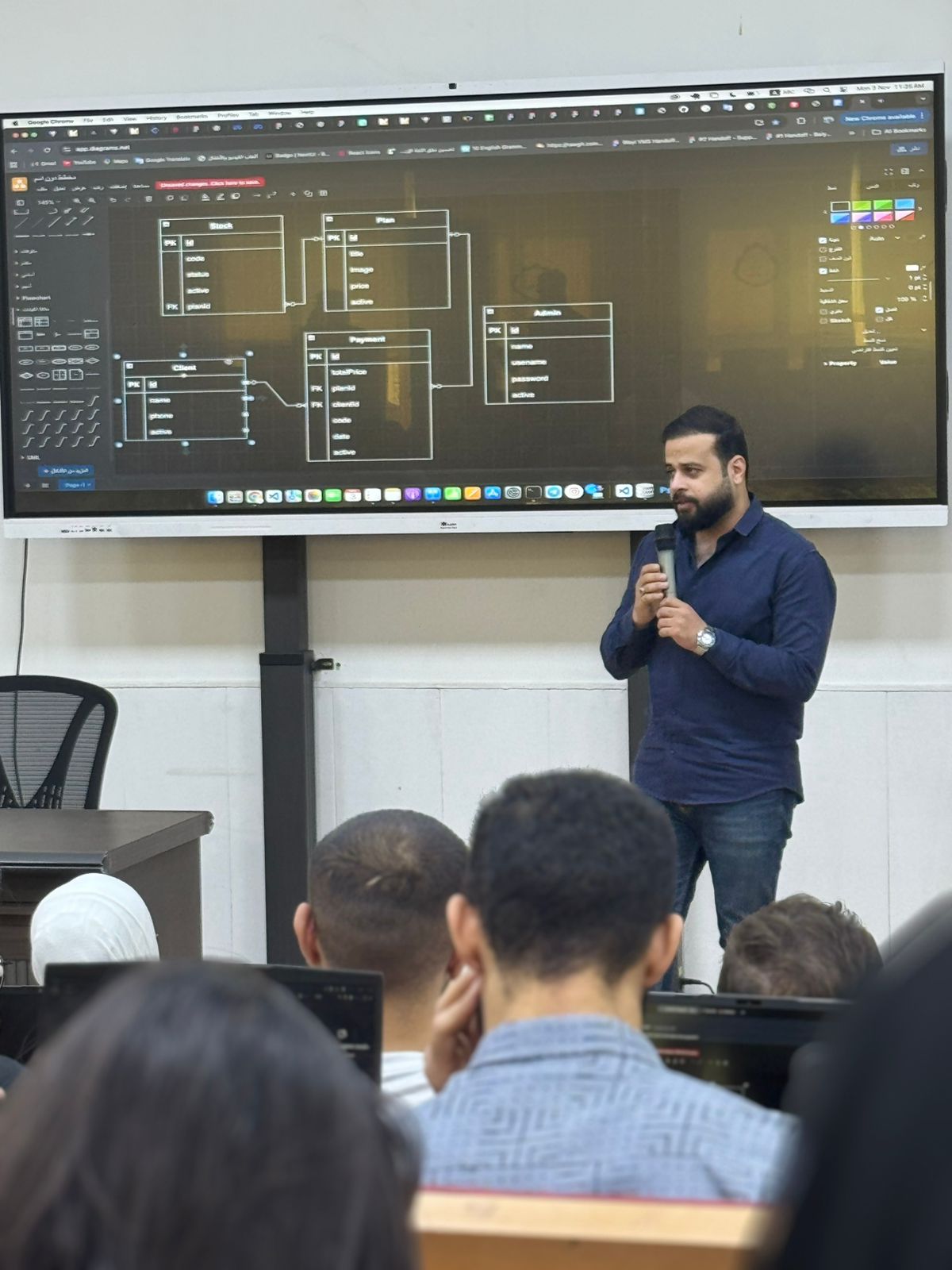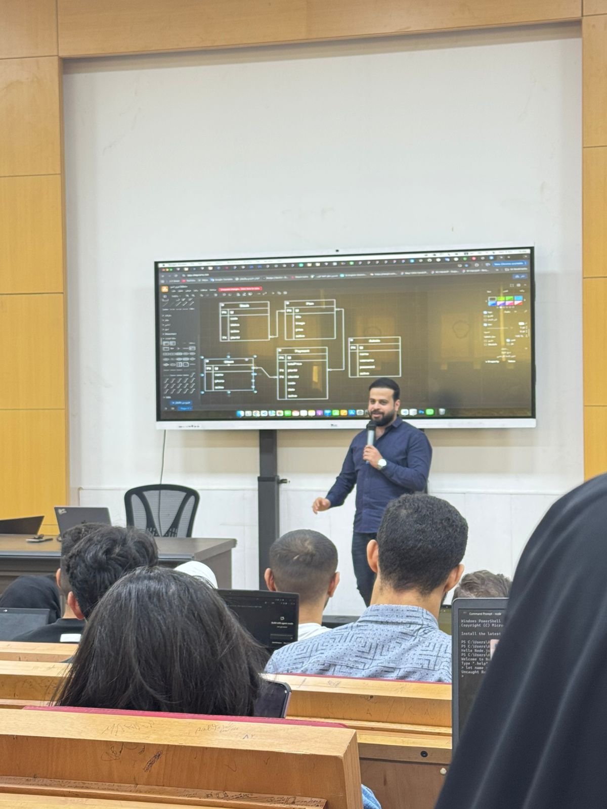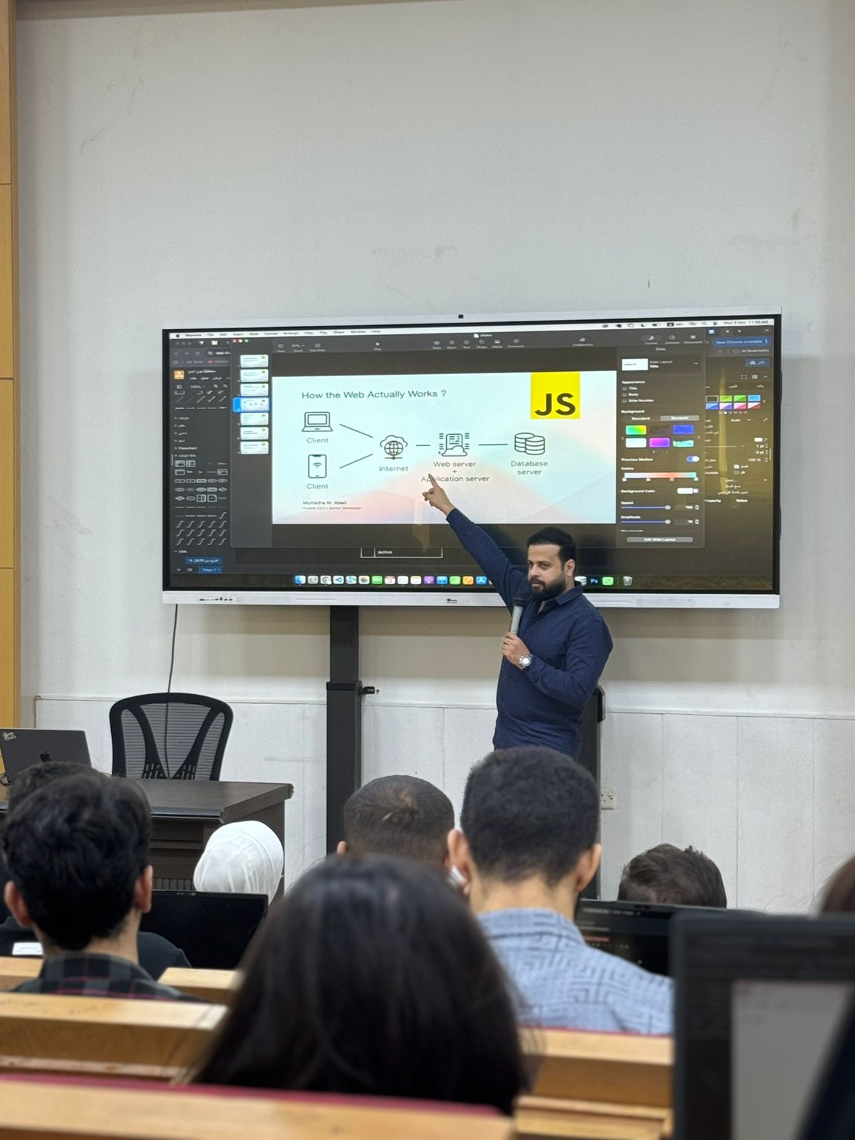 Mr. Murtadha highlighted the pivotal role of JavaScript in building modern systems, explaining how it has evolved into a comprehensive tool for creating integrated mobile and web applications within a unified environment. He also covered the technical foundations for designing Scalable Systems and the importance of Node.js in building high-performance solutions relied upon by major global companies.