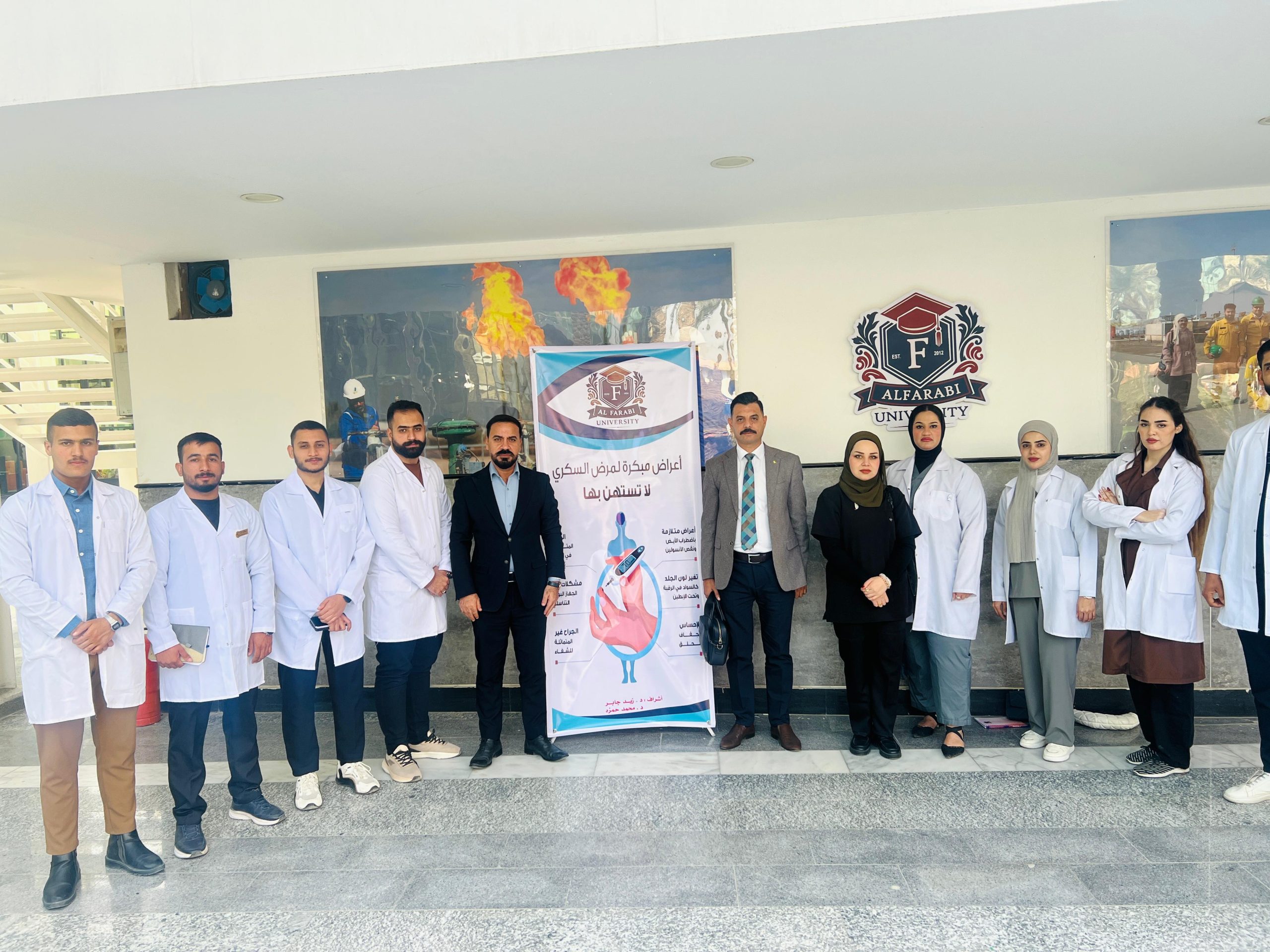 The College of Nursing at Al-Farabi University organized a scientific health initiative titled “Early Detection of Diabetes Mellitus among Al-Farabi University Students,” under the supervision of Dr. Zaid Jaber Hamad and Dr. Muhammad Hamza Mahdi.