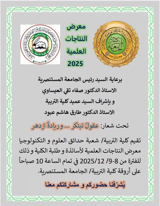 In response to an official invitation, Al-Farabi University participated prominently in the “Entrepreneurship Week” organized by the College of Education at Al-Mustansiriya University on Monday, December 8, 2025. Al-Farabi University hosted the largest pavilion at the event, showcasing distinguished student projects from the Department of Cybersecurity and the Department of Interior Design, under the supervision of faculty members.