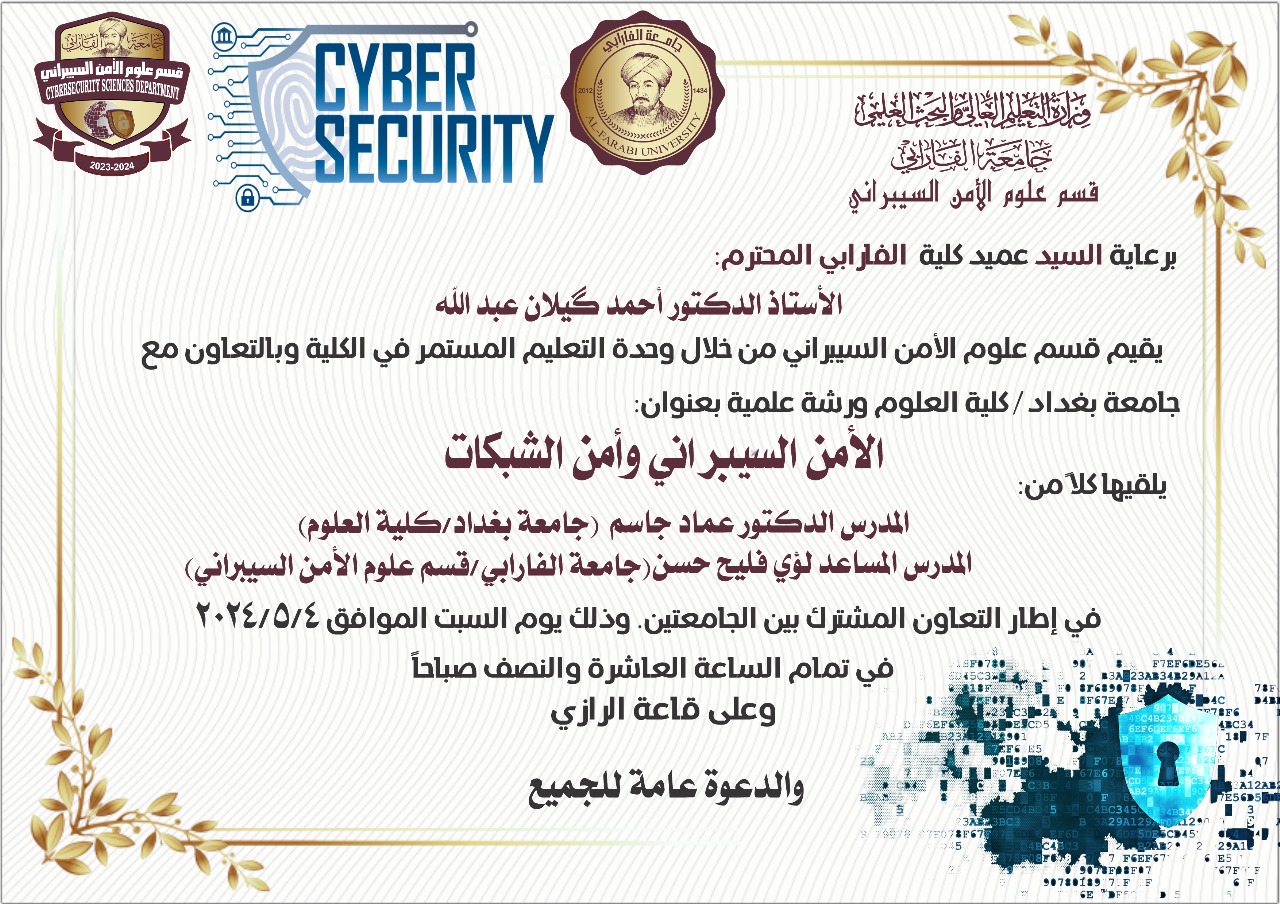 برعاية السيد عميد كلية الفارابي المحترم الأستاذ الدكتور احمد كيلان عبد الله، يقيم قسم علوم الامن السيبراني من خلال وحدة التعليم المستمر في الكلية وبالتعاون مع جامعة بغداد / كلية العلوم ورشة علمية بعنوان : الامن السيبراني وأمن الشبكات يلقيها كلاً من : 1 – المدرس الدكتور عماد جاسم (جامعة بغداد / كلية العلوم) 2 – المدرس المساعد لؤي فليح حسن (جامعة الفارابي / قسم علوم الامن السيبراني) في اطار التعاون المشترك بين الجامعتين وذلك يوم لسبت الموافق 4/5/2024 في تمام الساعة العاشرة والنصف صباحاً وعلى قاعة الرازي والدعوة عامة للجميع