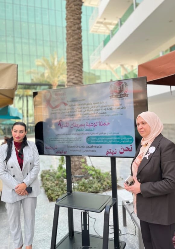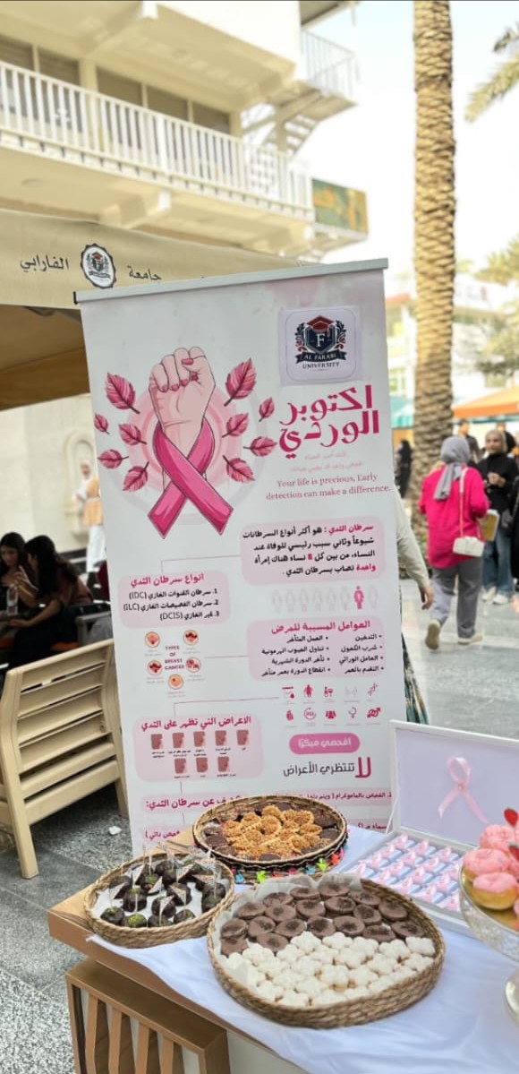 نظّمت شعبة شؤون المرأة في جامعة الفارابي، وبالتعاون مع كلية الصيدلة، فعالية توعوية بمناسبة شهر التوعية بسرطان الثدي، وذلك يوم الاثنين الموافق 20/10/2025.