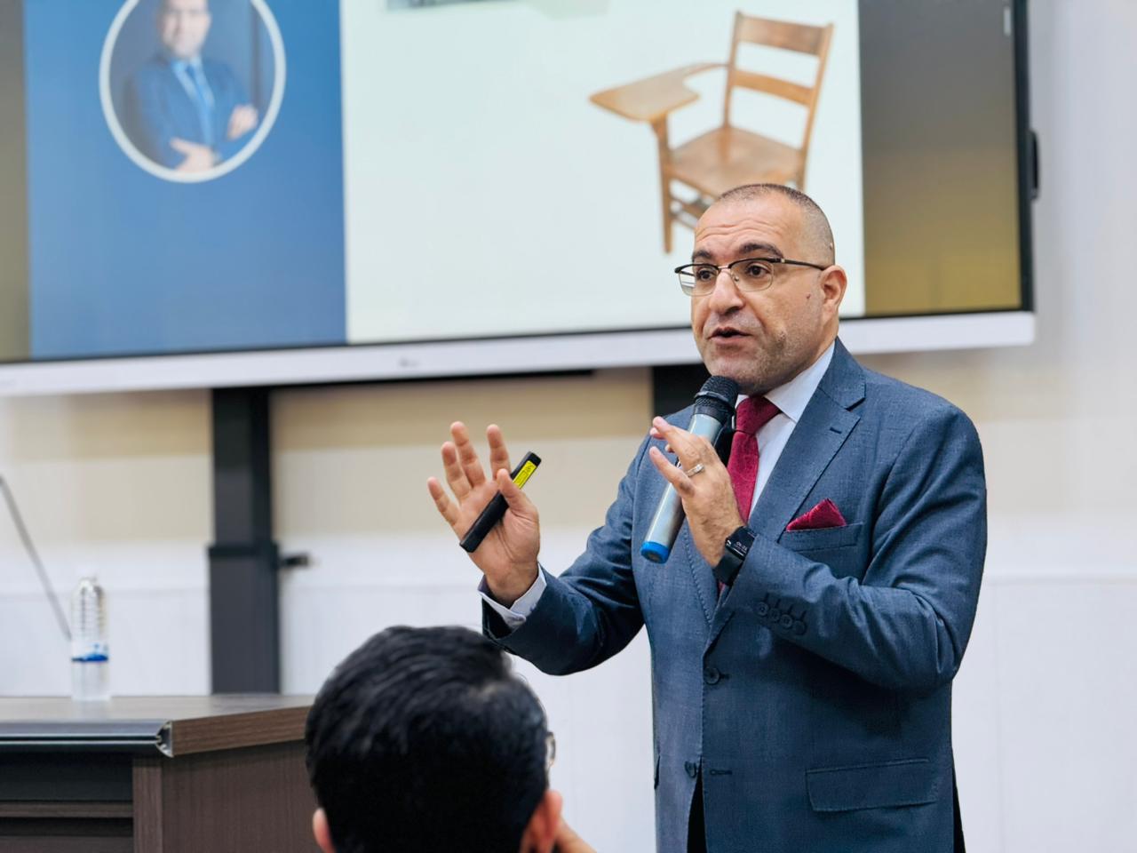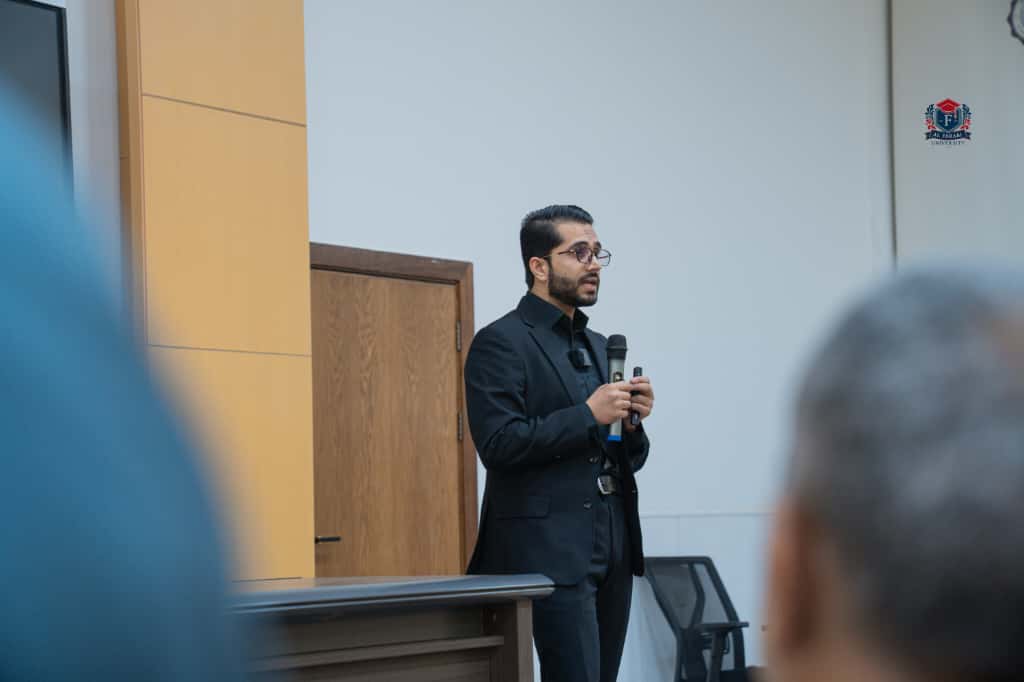 • الأستاذ الدكتور مازن الحكيم – مساعد رئيس الجامعة للشؤون العلمية، الذي قدّم رؤية الجامعة في دعم الطلبة وتمكينهم من مهارات المستقبل.