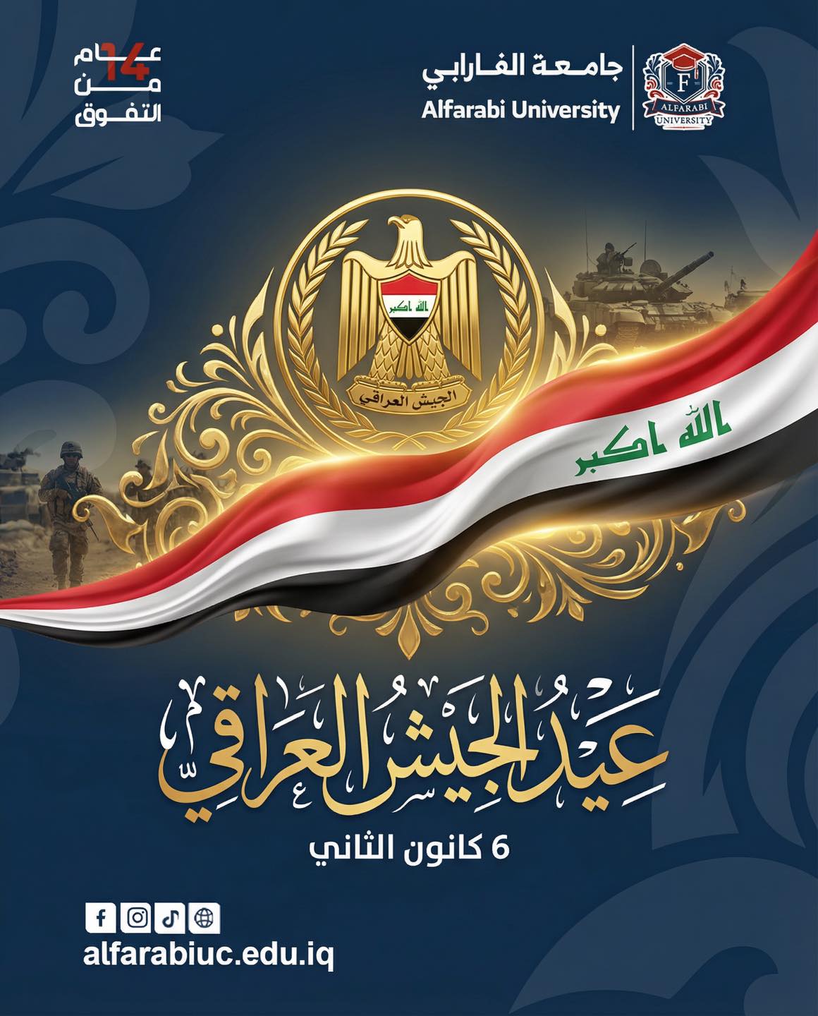 بكل فخر واعتزاز، أصدرت جامعة الفارابي، ممثلة برئاستها وتدريسييها وطلبتها، بيان تهنئة بمناسبة ذكرى تأسيس الجيش العراقي الباسل، معربة عن أسمى آيات التهاني والتبريكات لقادة وضباط ومراتب جيشنا المغوار.