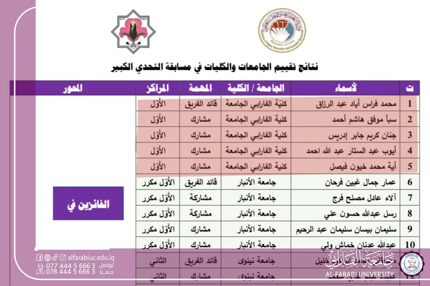 حصد فريق جامعة الفارابي على المركز الاول في مسابقة التحدي الكبير (الافتراضية) التي يشرف عليها قسم النشاطات الطلابية في وزارة التعليم العالي والبحث العلمي. تضمنت المسابقة خمسة محاور ( محور خدمة البيئة، محور الحوار من اجل السلام، محور التراث والتاريخ، محور التنمية والمستدامة ، محور تقنية المعلومات) بمشاركة (64)جامعة وكلية حكومية واهلية، وشارك فريق جامعتنا في محور خدمة البيئة. ويأتي هذا النشاط ضمن المنهاج السنوي المقرر لوحدة النشاطات الطلابية والتي تسعى عمادة الجامعة من خلالهِ الى كشف وصقل مواهب الطلبة .