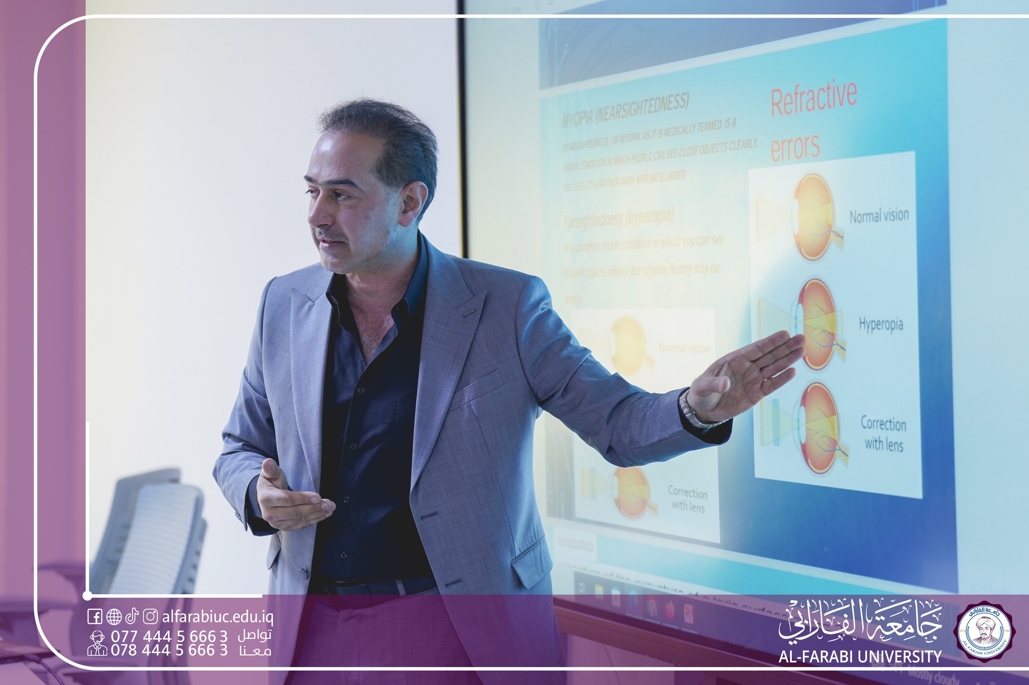 أقام قسم تقنيات البصريات في جامعة الفارابي ندوة بعنوان: ( الثقافة البصرية , وتشخيص عيوب الإبصار ) ألقاها الأستاذ الدكتور ( مضر صباح العسلي ) من الجامعة التقنية الوسطى / كلية التقنية الصحية.